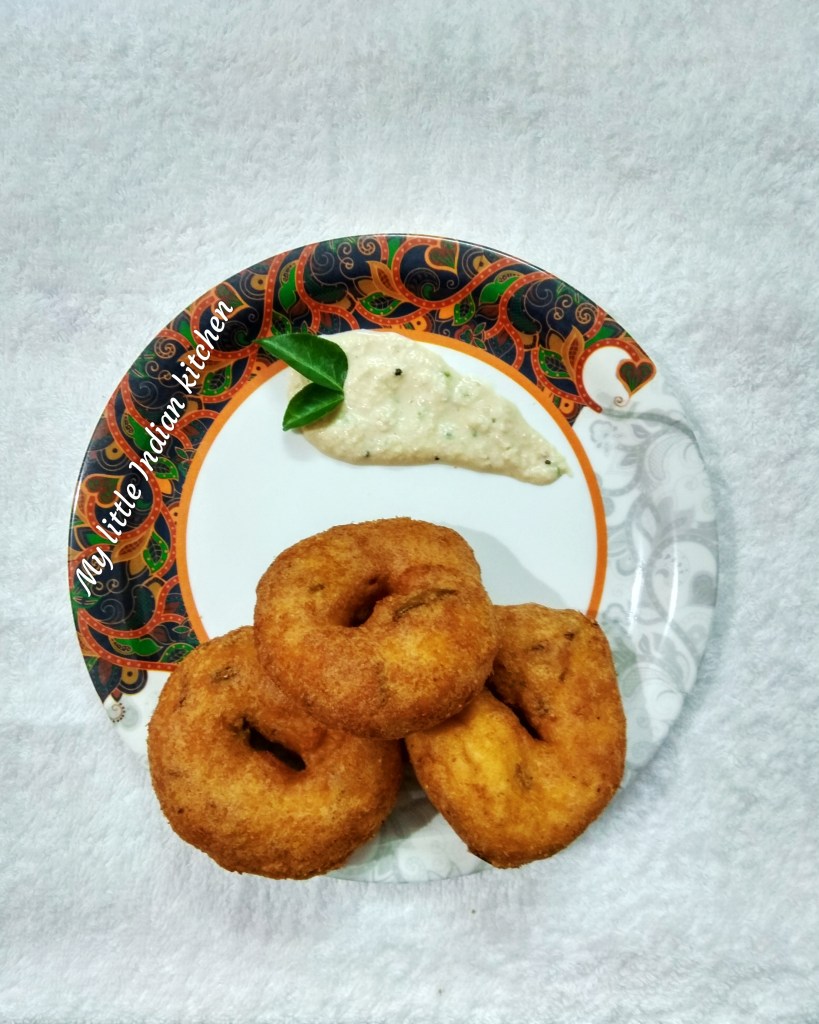 Uzhunnu vada or vada is a deep fried savory snack made of lentils. Vada is the most popular food in south India served for breakfast or as a snack. Usually they are made by soaking and grinding urad dal then small portions of this batter is deep fried into round shaped. Apart from coconut chutney, these also taste great when paired with sambar (mixed lentil and vegetable curry).