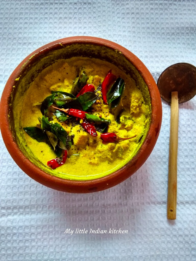 Kalan/kurukku kalan is a delicious side dish made of yam and raw banana. It is little thick in consistency and has a smooth,silky texture. This can be prepared and stored for about a week. Since its gets thick with time it is mostly prepared the previous day of sadhya.