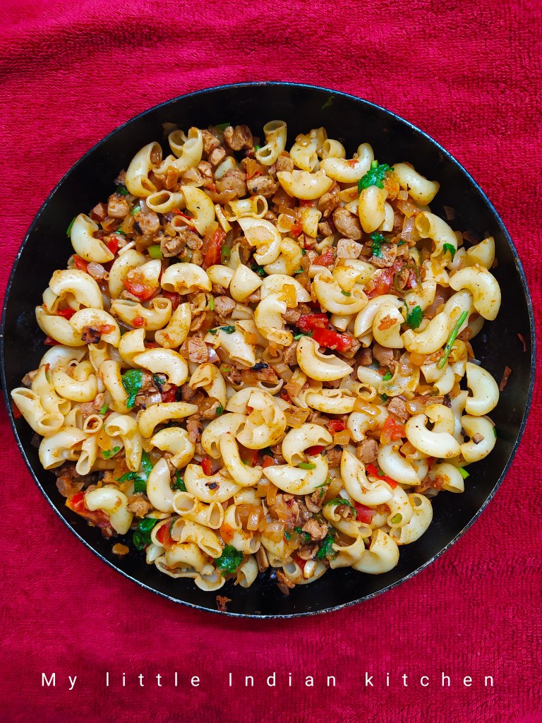 Macaroni with soy nuggets is the best snack option for those are craving for a restaurant style pasta as it is on a much healthier side and tastes equally delicious. This dish offers rich source of protein, dietary fiber and carbohydrates from the wheat based macaroni and more protein from the soy nuggets.