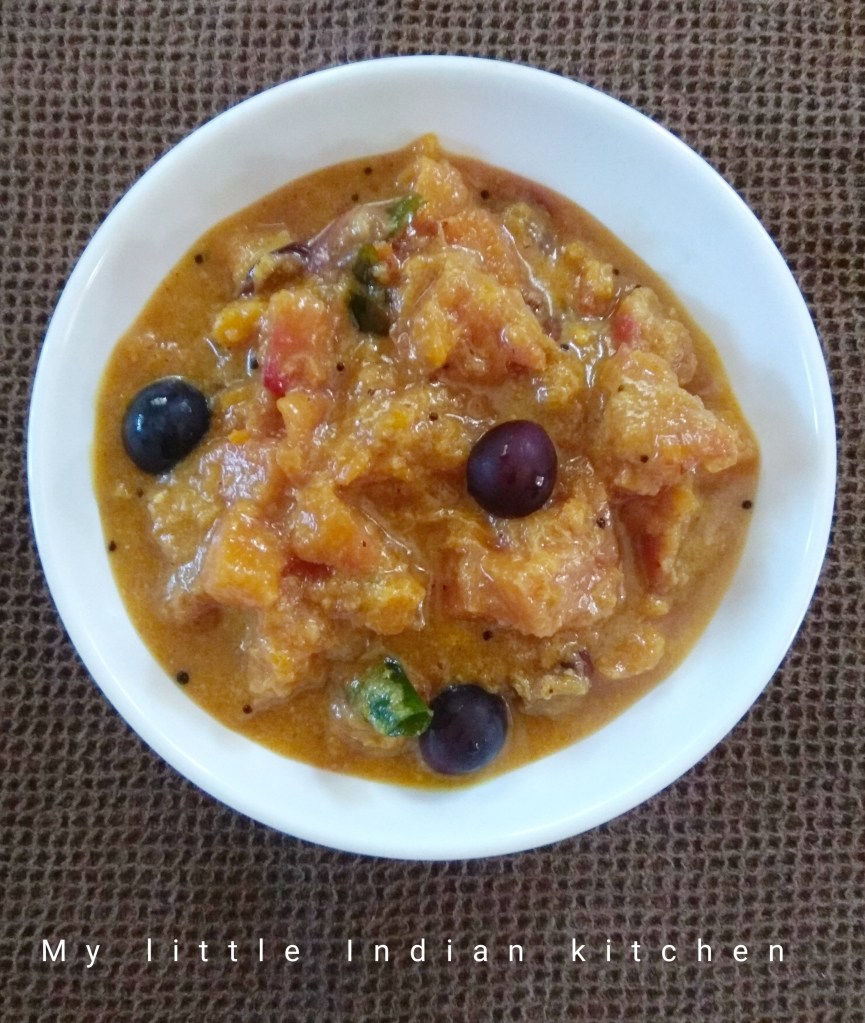 A Kerala style sweet and sour curry made with pineapple, banana, grapes and yogurt. ‘Madhuram’ in Malayalam means sweetness. As the name implies, it’s a sweet dish made with fruits like pineapple, ripe plantain and grapes. This is a great side dish for a sadhya, perfect to balance your palate along with the other curries. If you are preparing this curry for a regular meal, have it alongside a spicy curry, it just blends well.