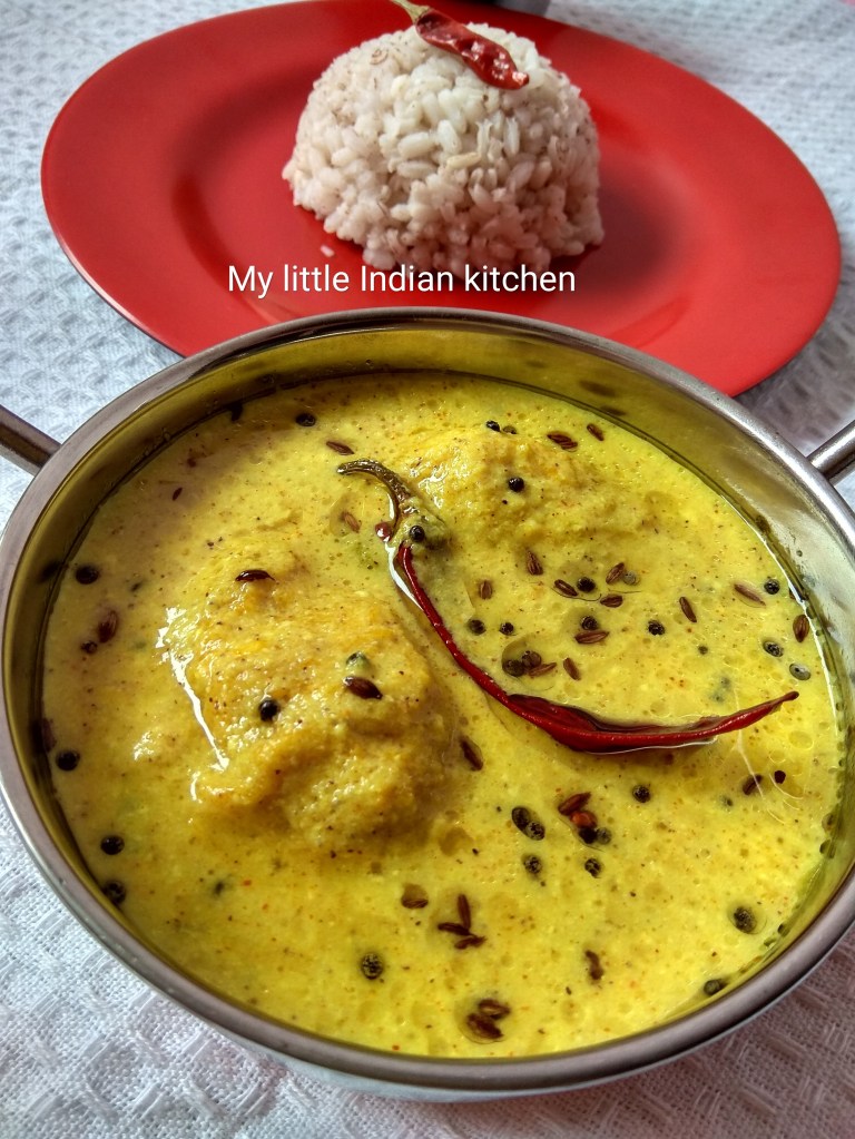 - Further add beaten curd, mix well. Cook for a minute and turn off the flame. Do not allow the curry to boil.