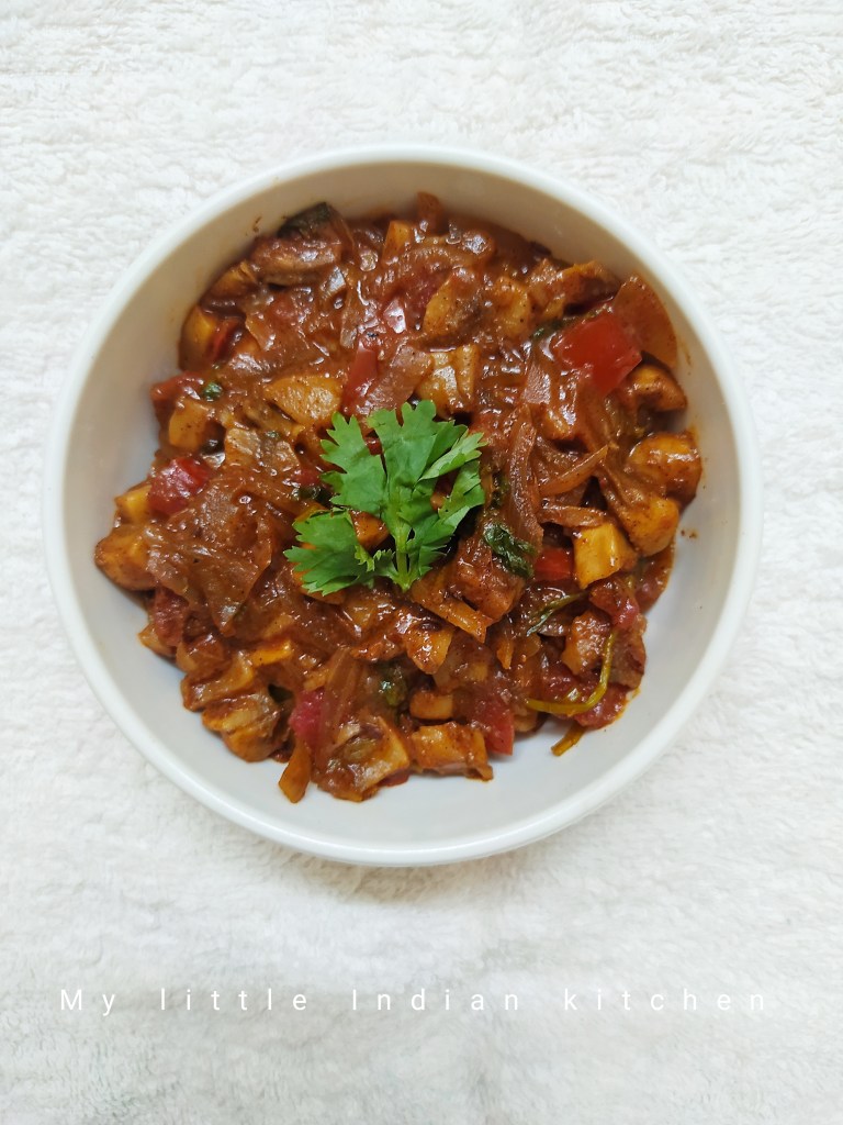 This mushroom pepper fry is chettinad based, spicy and quick fry. Mushrooms are protein packed and best vegetarian alternative to meat. The addition of pepper along with mushrooms takes the dish to a new level. Small button mushrooms works best for this recipe. This fry goes well with chapati/roti but can be paired with rice too.
