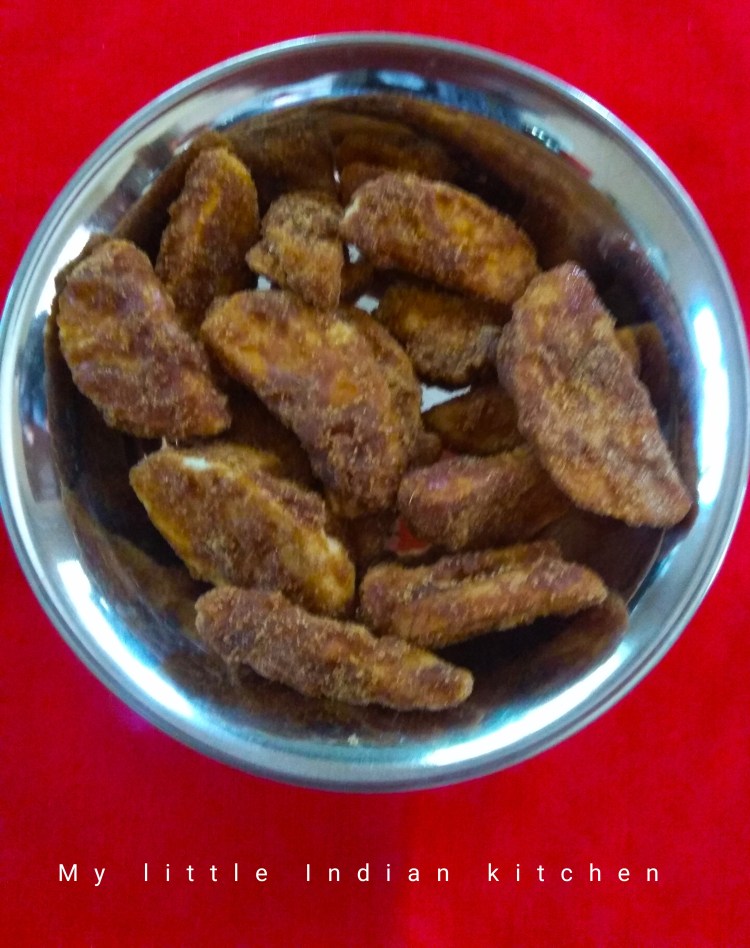 A typical sadhya has banana chips, thick jaggery-coated banana chips popularly known as ‘sharkara varatti’ in Malayalam, pappadam and pazham (banana) on the extreme left corner of the banana leaf.